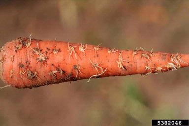 | Prolifération de poils racinaires sur une racine tubérisée de carotte causée par Candidatus Phytoplasma asteris. Crédit photo: Whitney Cranshaw, Colorado State University, Bugwood.org |