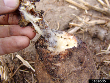 - Pourritures molles et humides : tissus végétaux gorgés d'eau, mous et décomposés, souvent associées à une odeur désagréable (odeur de moisi), très fréquentes sur organes souterrains comme les tubercules, racines tubérisées, bulbes, etc. (ex. Pectobacterium spp., Dickeya spp.).