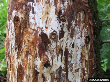 | Aiguilles de Pin blanc affecté par Cronartium ribicola, l'agent de la rouille vésiculeuse. Maladie exotique introduite d' Europe vers le début du 20e siècle, la rouille vésiculeuse du pin blanc est l'une des plus importantes maladies forestières en Amérique du Nord. Crédit photo : Claude Moffet - Service canadien des forêts / Ressources naturelles du Canada |