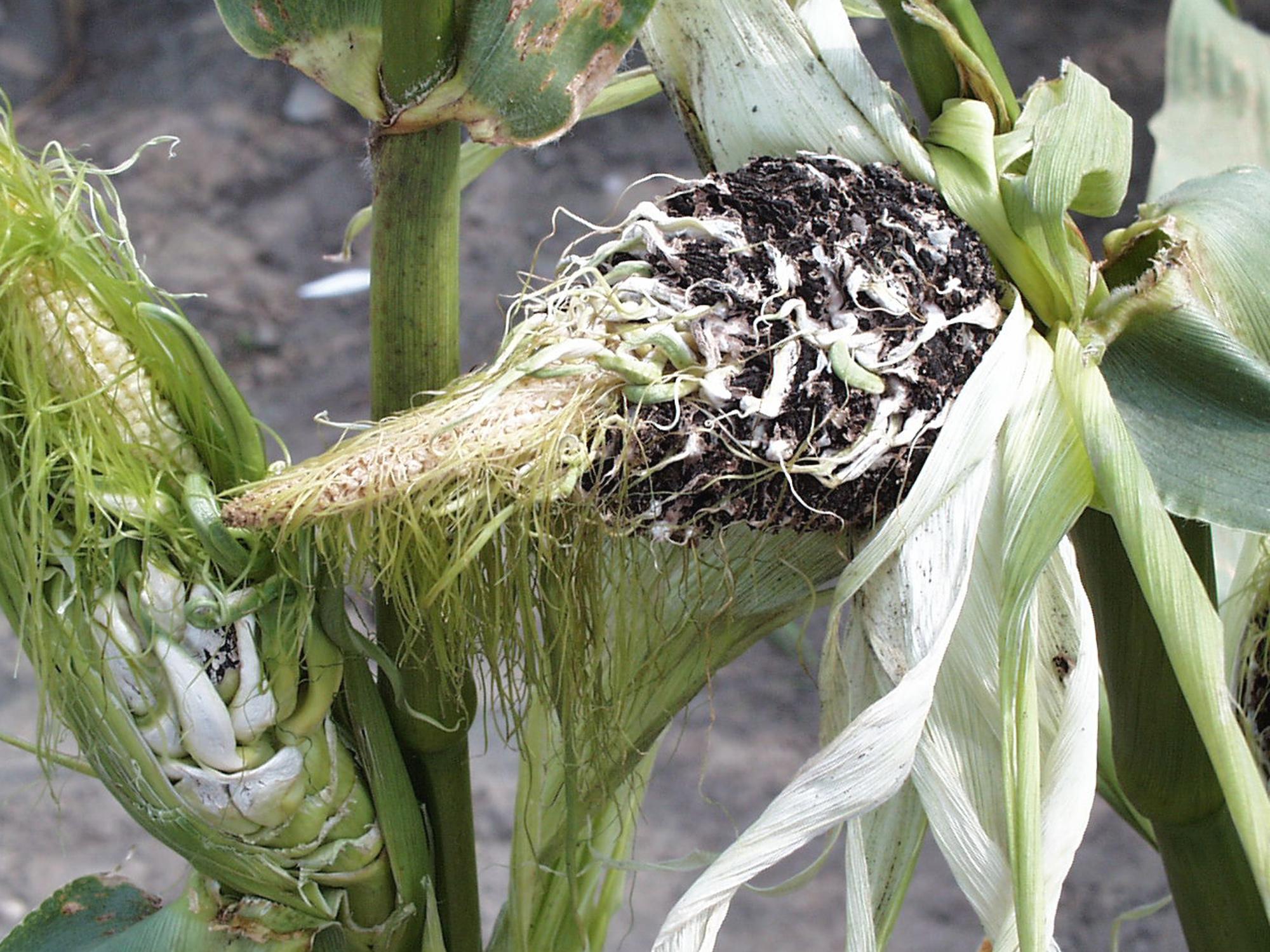 | Spores noires d'Ustilago smaydis (charbon commun) sur épi de maïs grain et fourrager. U. maydis s'attaque principalement aux épis de maïs. En pénétrant les tissus et les cellules, les hyphes causent la formation de gales difformes (tumeurs). À maturité, les gales crèvent et libères des téliospores charbonneuses noires. Celles-ci peuvent réinfecter d'autres plants ou hiberner dans le sol. Crédit photo : © Pierre Lachance - MAPAQ (Iriis phytoprotection) |